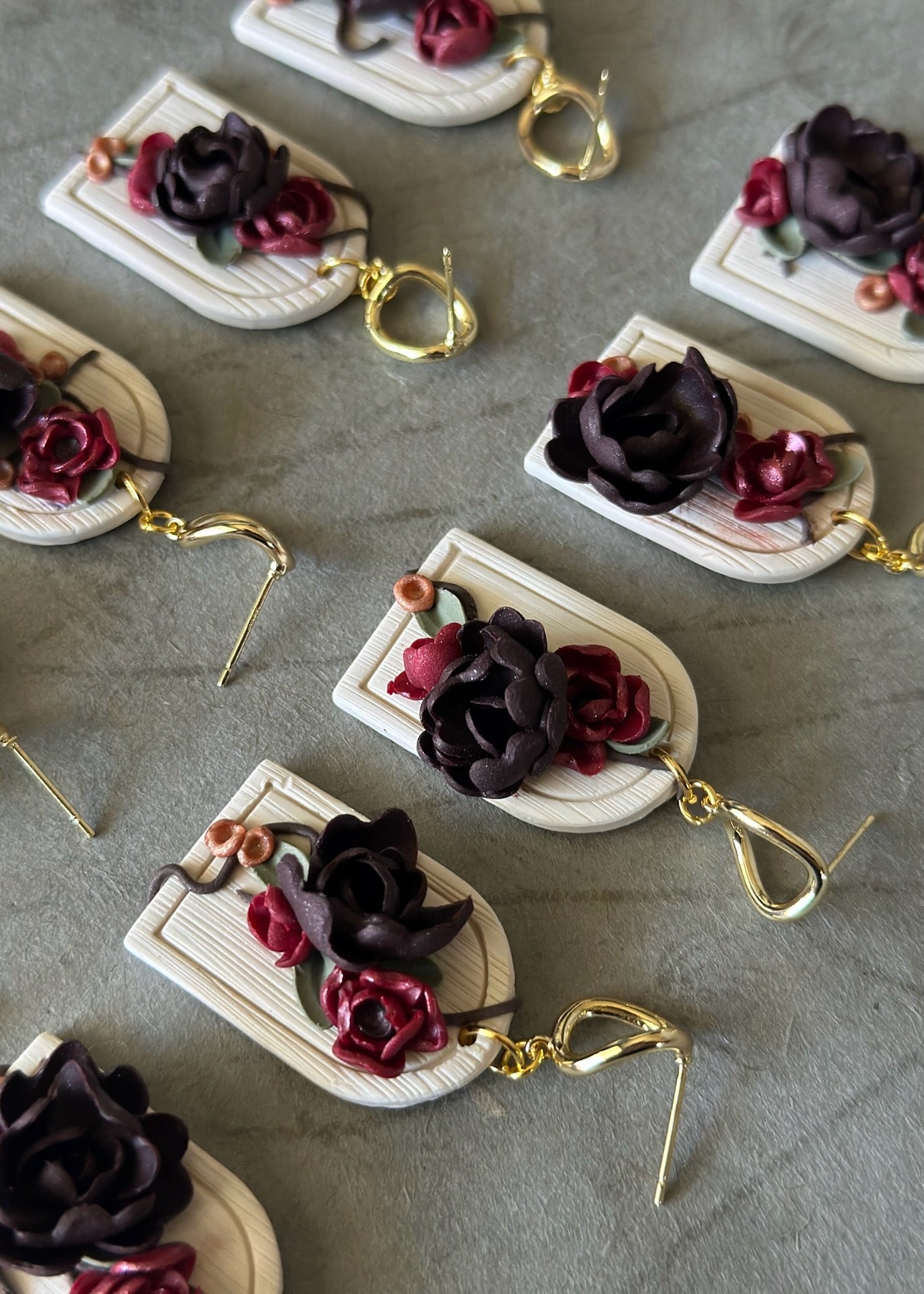 Hand‑formed from lightweight polymer clay in our MN studio and finished on gold hooks, they’re easy on ears and ready for market strolls, office parties, or dinner with friends. Color story: deep wine, rose, and cream accents with gentle texture that catches the light. Each bloom is shaped petal by petal—no molds—so every pair is uniquely yours. Style them with a cozy sweater or a simple black dress when you want a little seasonal glow that still works after the holidays.