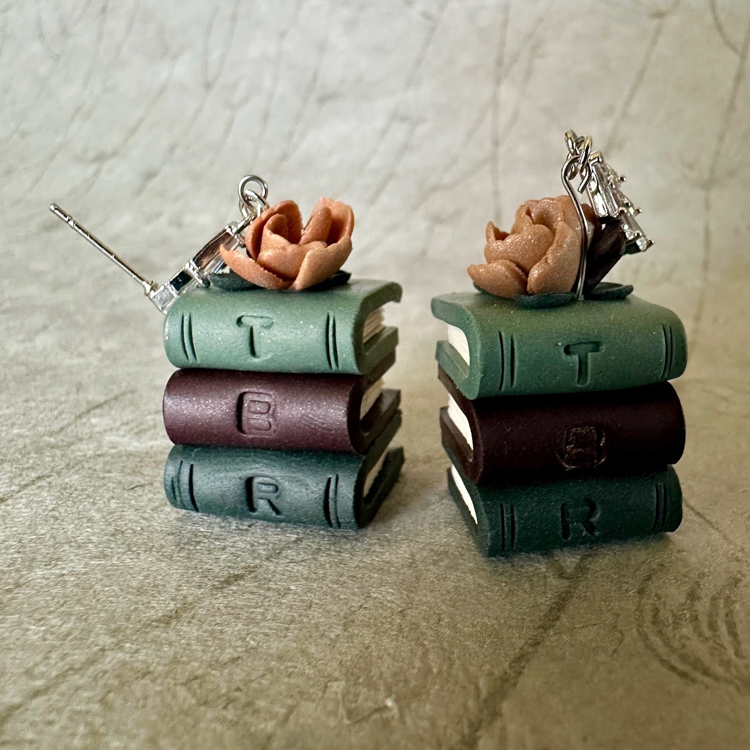 For the reader whose to‑be‑read pile is part ritual, part décor. These Holiday TBR Stack earrings celebrate a cozy stack of books—tiny hand‑sculpted volumes in warm burgundy and winter‑jewel tones with soft floral touches.