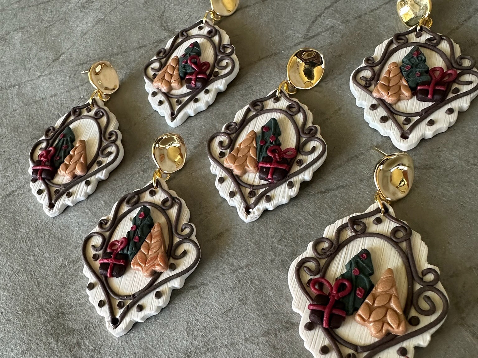 These framed tree‑and‑present earrings bring subtle holiday cheer with sculpted details and a warm burgundy‑and‑cream palette. Hand‑formed in our MN studio from lightweight polymer clay and finished with gold‑tone stud findings, they’re festive without tipping into flashy.